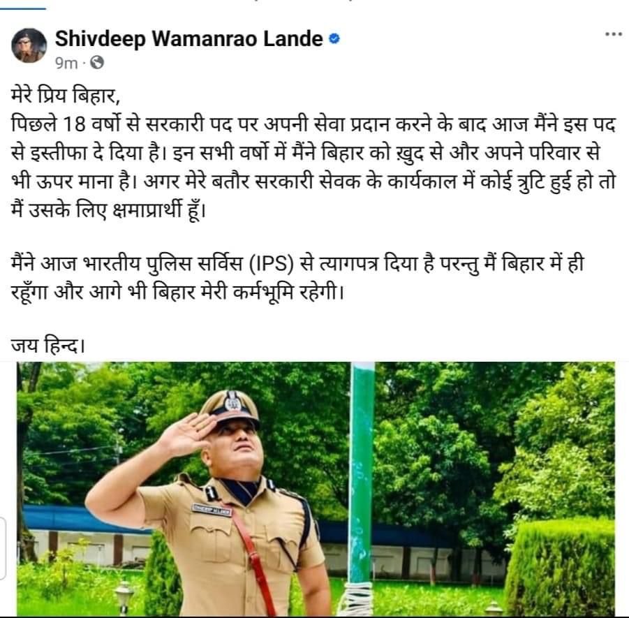 बिहार कैडर के चर्चित IPS अधिकारी शिवदीप वामन राव लांडे ने दिया इस्तीफा