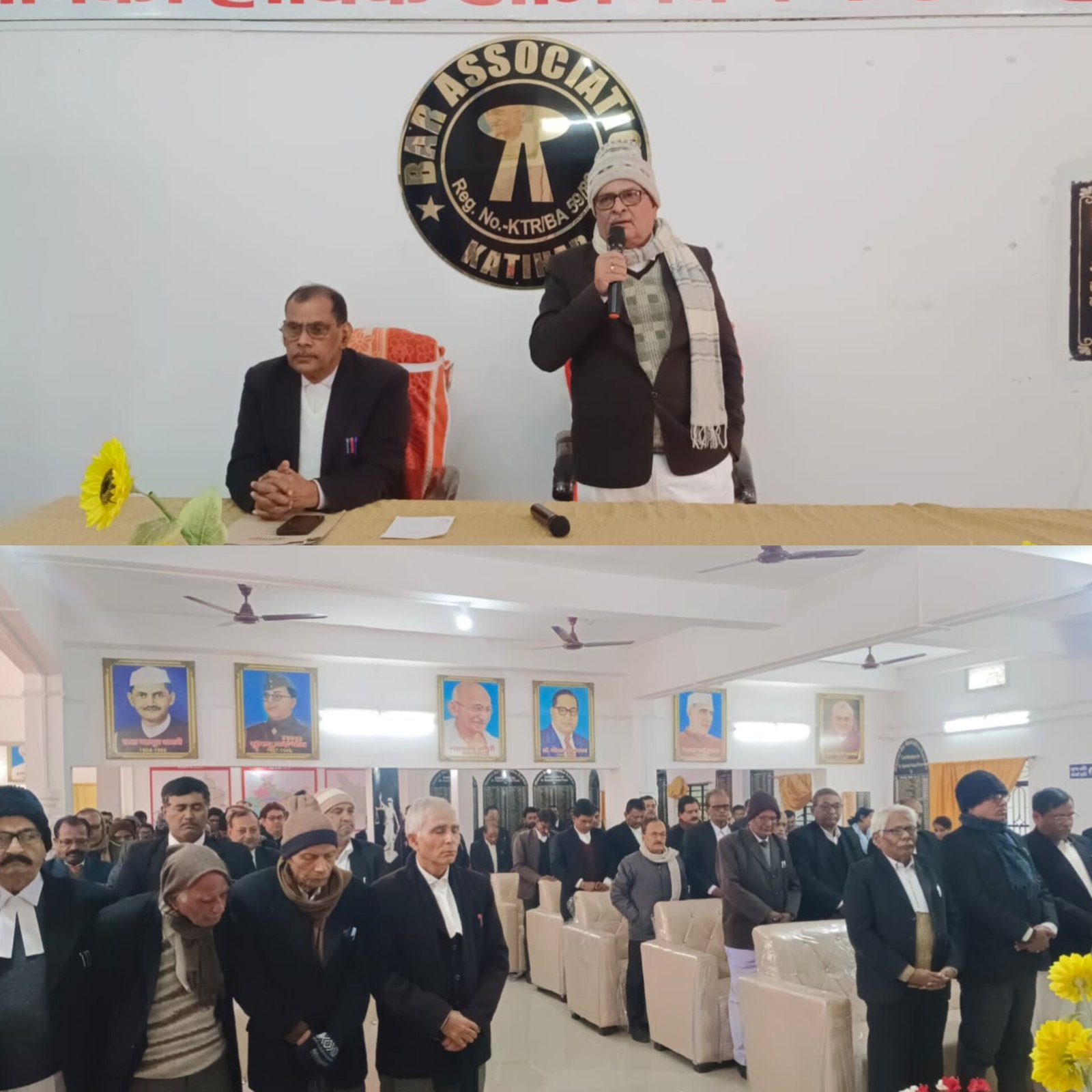 वही इस क्रम में बार एसोसिएशन द्वारा दिवंगत अधिवक्ता निरंजन कुमार शर्मा के आत्मा की शांति के लिए से शुक्रवार को बार एसोसिएशन के अध्यक्ष विजय कुमार झा एवं प्रधान जिला जज हेमंत कुमार त्रिपाठी की अध्यक्षता में दो मिनट का मोन रख कर दिवंगत आत्मा की शांति के लिए ईश्वर से प्रार्थना करते ही उन्हें श्रद्धांजलि दी गई। वही स्वर्गीय शर्मा के मृत्यु के कारण अधिवक्ताओं ने शुक्रवार को अपने आप को पूरी तरह से न्यायिक कार्य से अलग रखा।